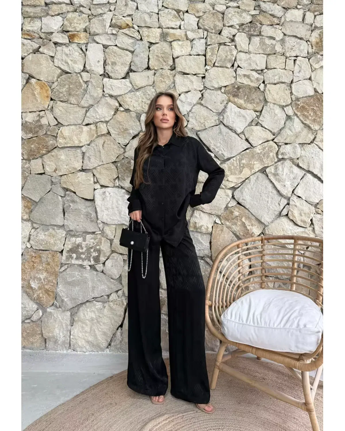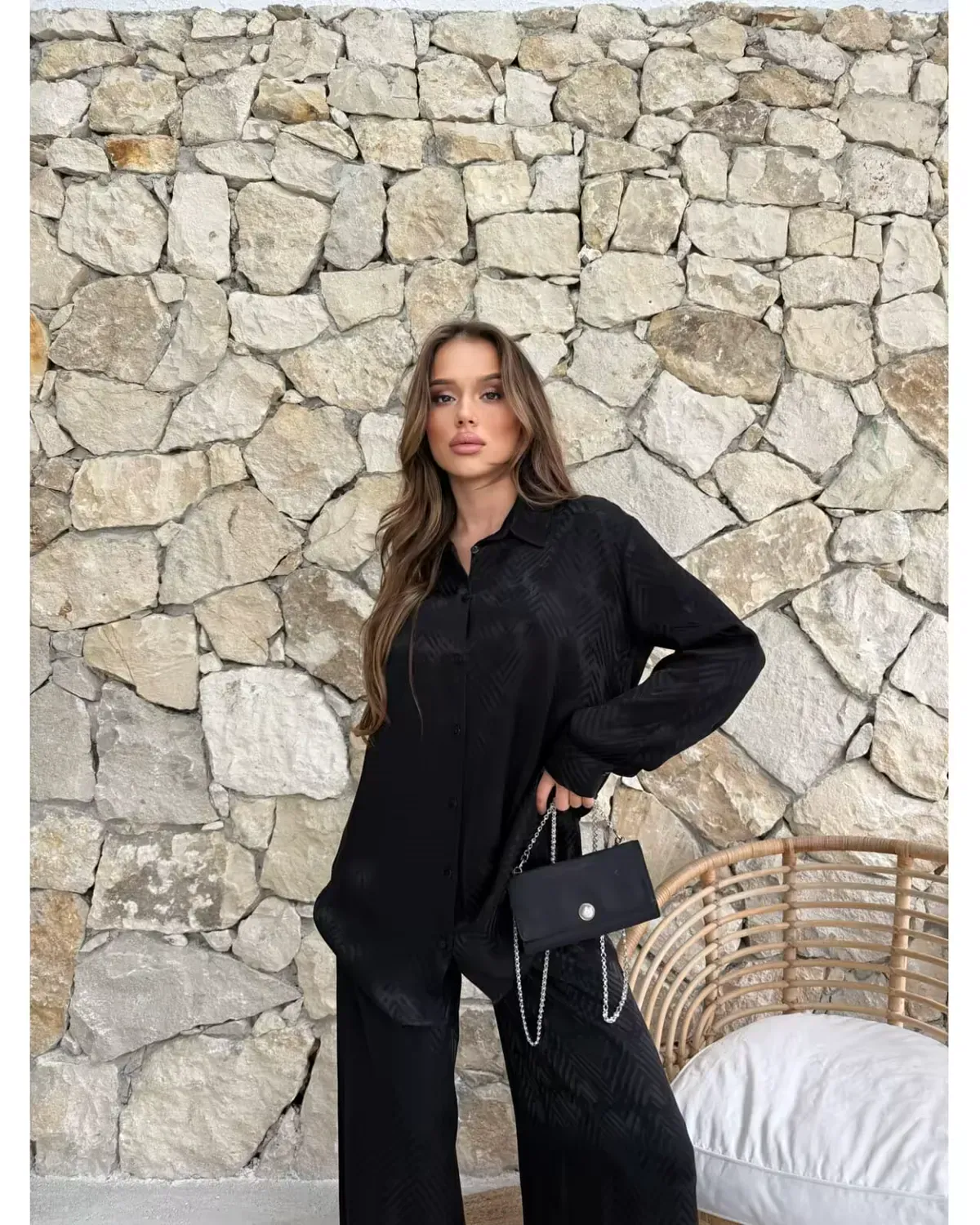 🌟 Klasik ve zamansız bir şıklık arıyorsanız, jakarlı siyah saten takım tam size göre! Özel dokusu ve zarif tasarımıyla stilinizi ön plana çıkarın.