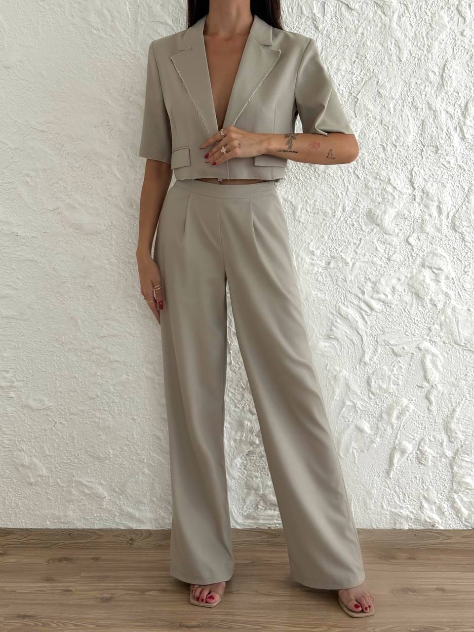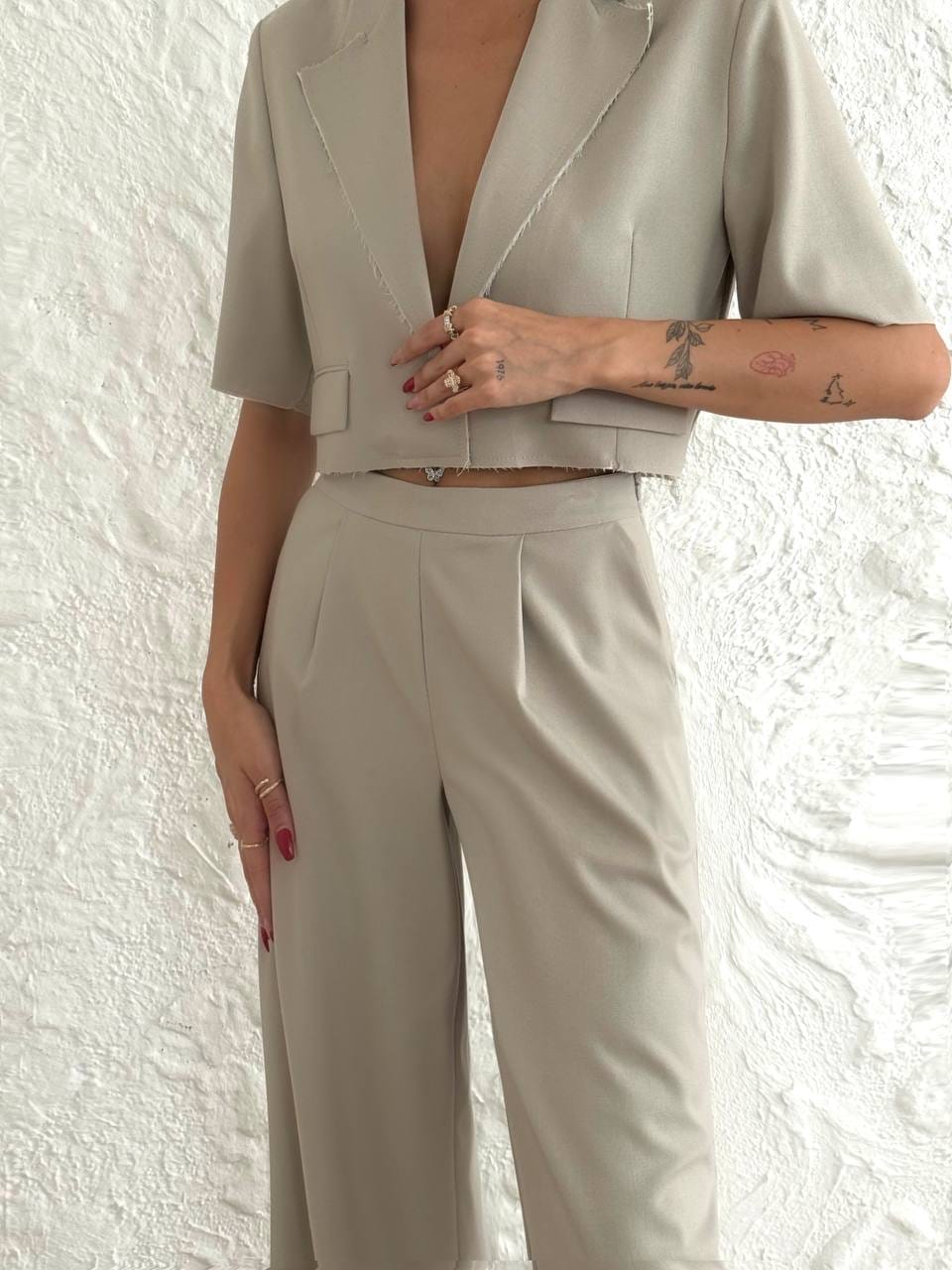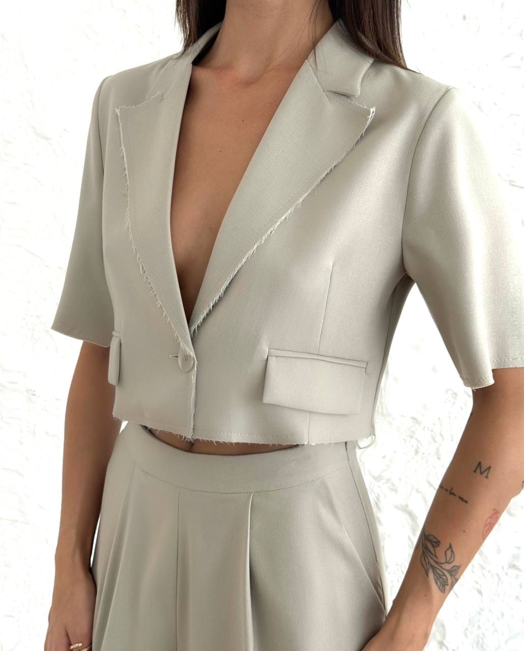 Krem kısa kol crop ceket takımla sadeliğin şıklığını tarzınıza yansıtın! 🌟