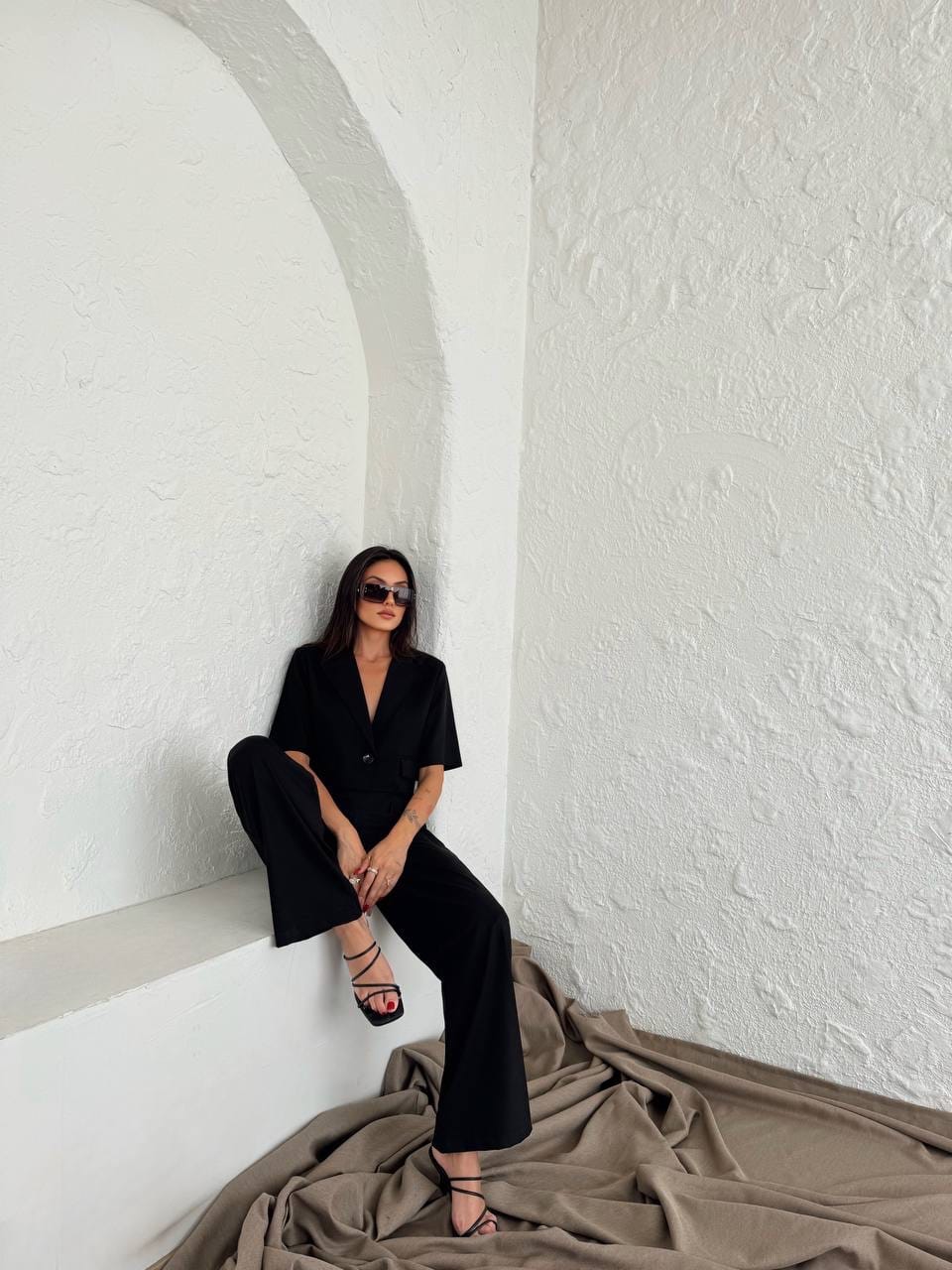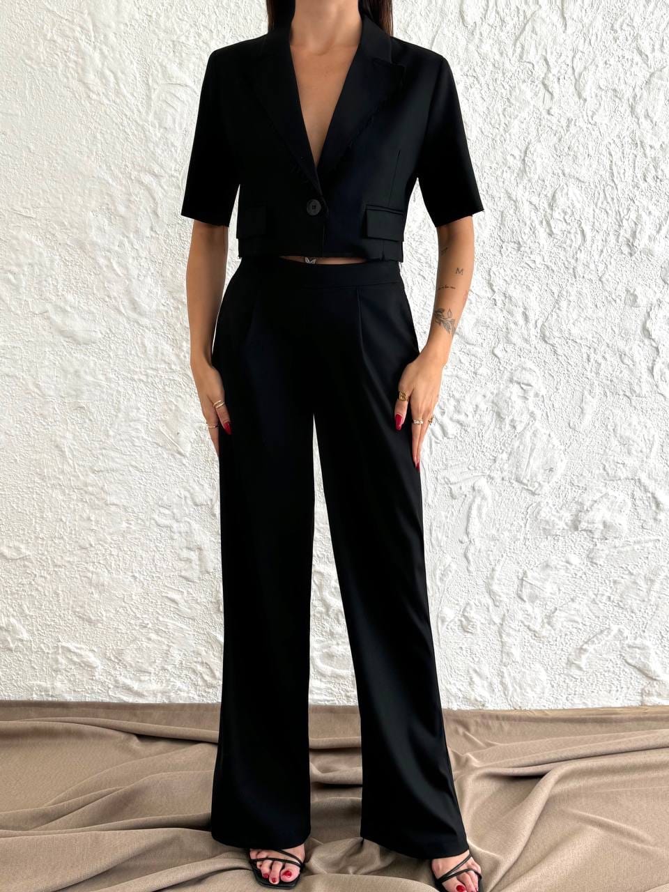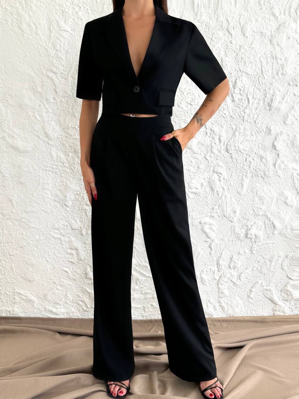 Siyah kısa kol crop ceket takımla, modern bir görünüm ve zarafet bir arada! 🖤