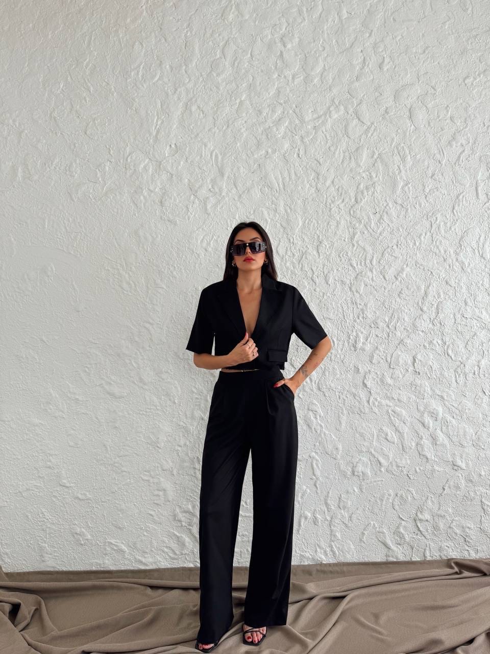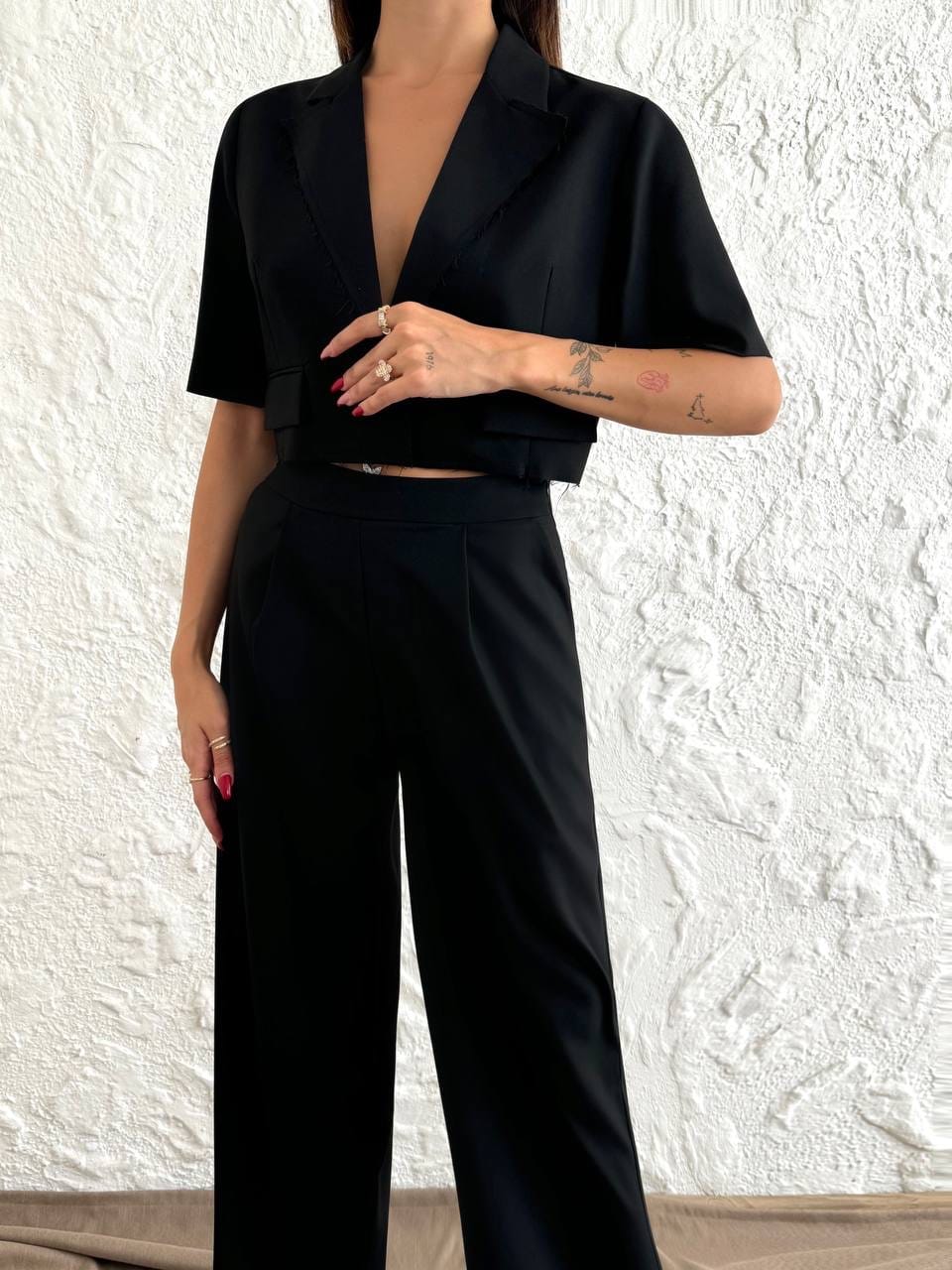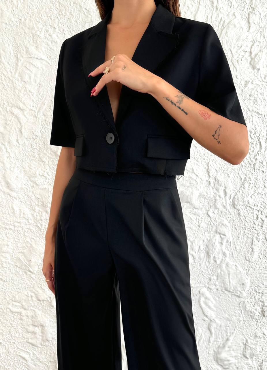 🌟 Modern ve iddialı bir görünüm arayanlar için siyah kısa kol crop ceket takım, dolabınızın en gözde parçalarından biri olacak